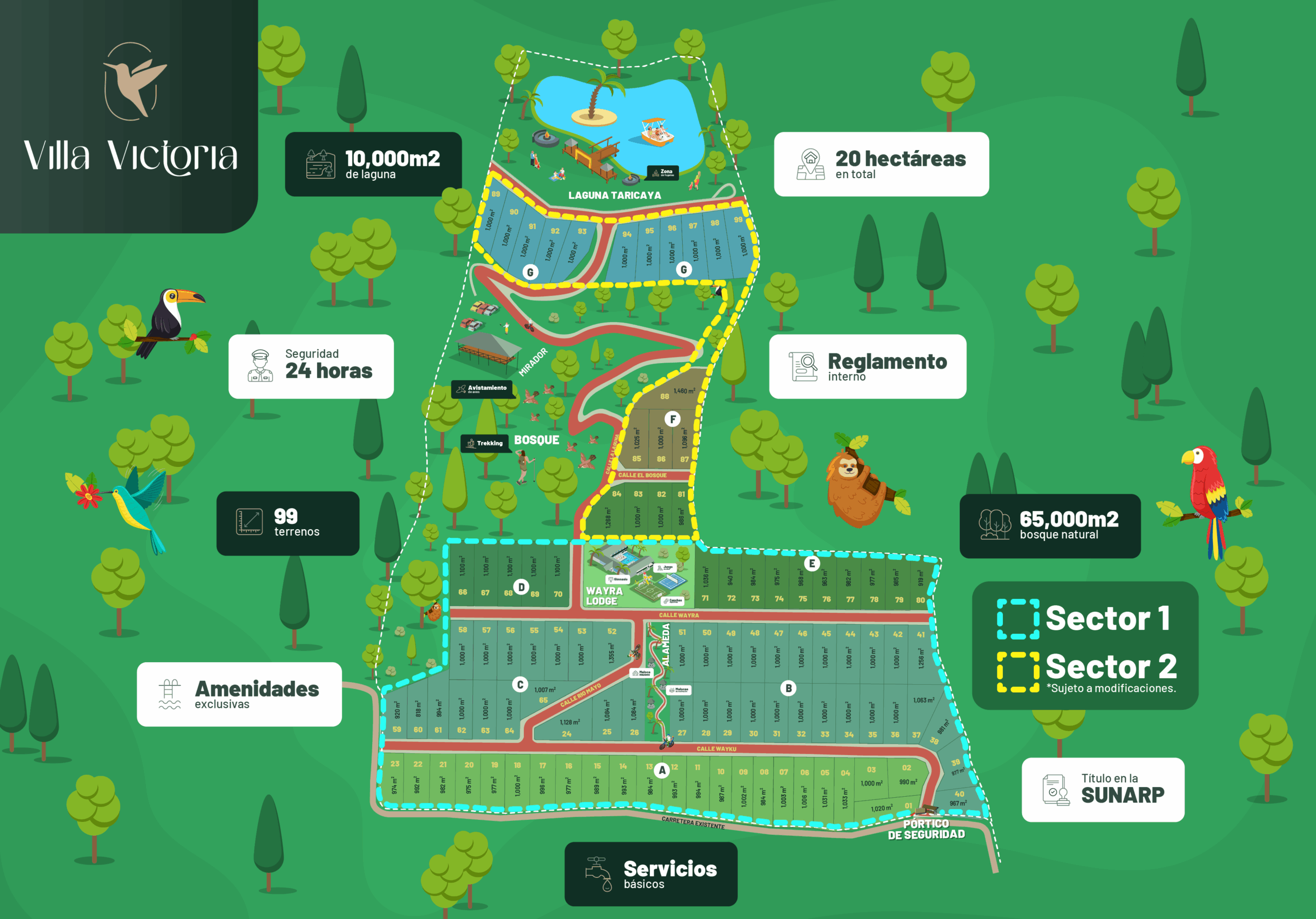En el corazón de Tarapoto, Villa Victoria es un condominio único para quienes buscan privacidad, paisajes impresionantes y un estilo de vida elevado. Con terrenos desde 1,000 m², ofrece una laguna privada de 10,000 m², una reserva natural de 65,000 m² y acceso al exclusivo Wayra Lodge, con piscina infinita, áreas de juego, canchas deportivas y restaurante de categoría.